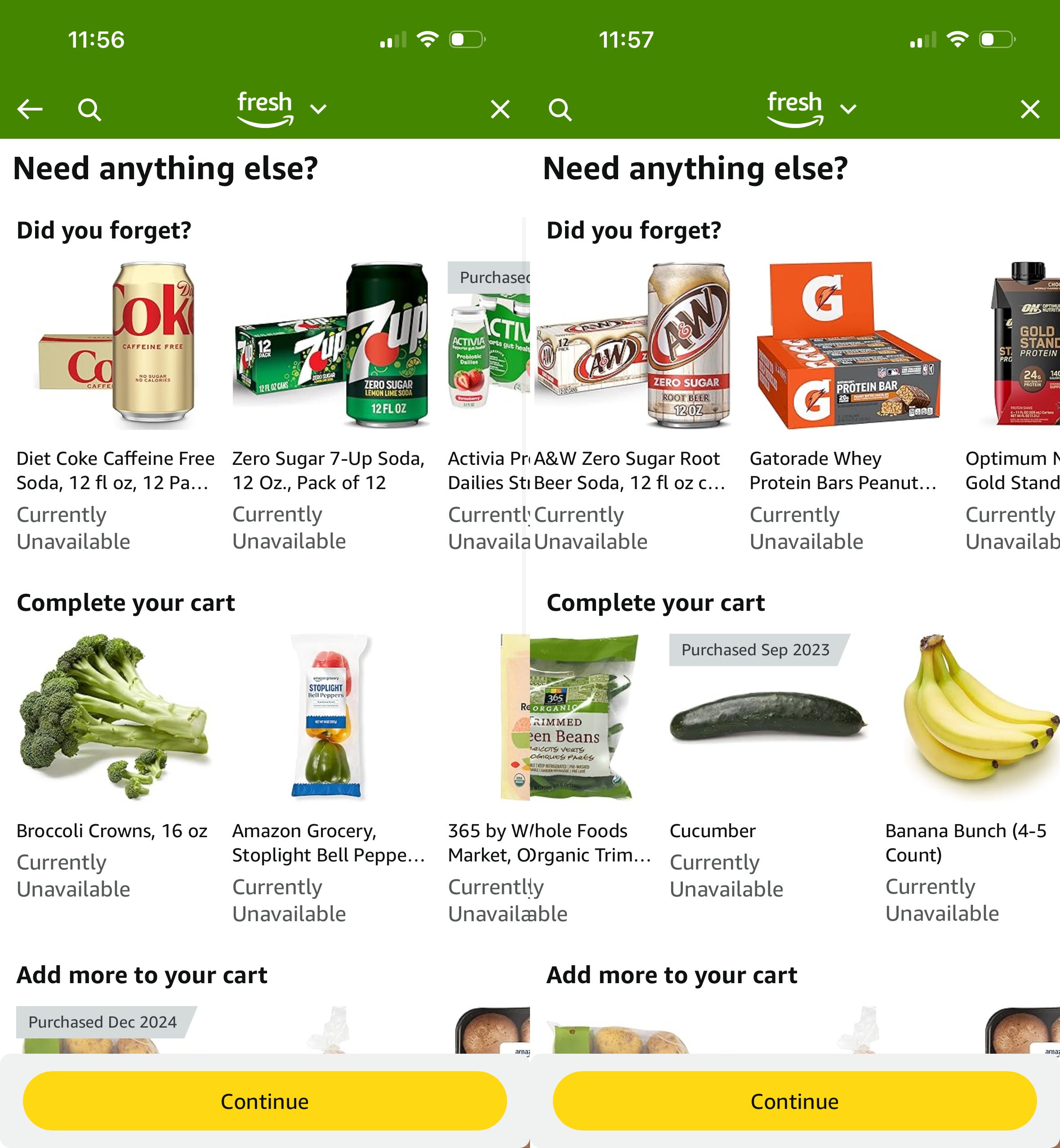 I opened Amazon Fresh to reorder my usual groceries. Bananas: currently unavailable. Honeycrisp apple: currently unavailable. Greek yogurt: currently unavailable. Broccoli: currently unavailable. The app scrolled on. Everything in “Did you forget?” and “Complete your cart”; every single item my purchase history suggested: currently unavailable.